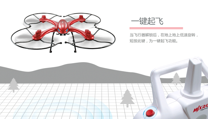 一键起飞:在对频之后,按“一键起飞”,螺旋桨开始工作,再按一下,无人机就会快速升空,摆脱地面效应,然后玩家通过油门操纵杆,来控制高度。