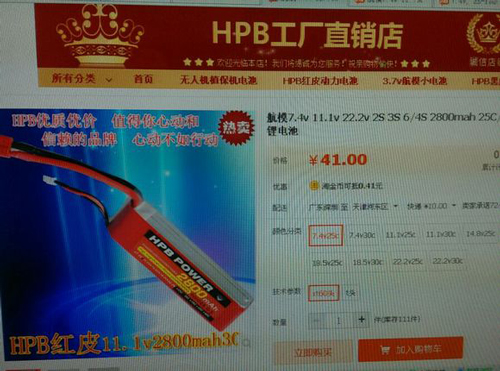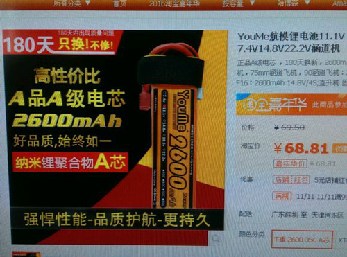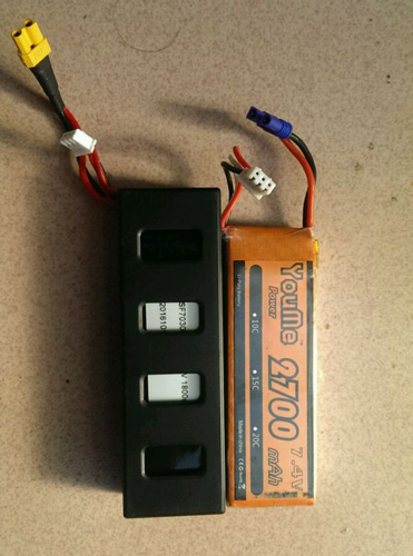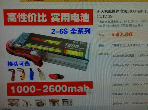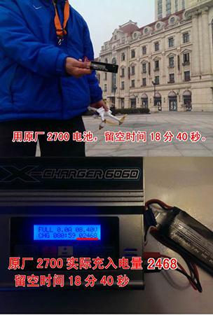 曾经用过2700电池,10C的,飞行7--8分钟后,飞机断电,坠落,不知什么原因?有空再试试2600电池,15C的。现在卖的2600电池是标明25C的。(指501专用电池。501电池比通用电池尺寸要小,价格要贵,只是插头已改501的插头。同样的电池,T插和XT60插头的都便宜。其实不用电池盒,通用电池尺寸就行。
