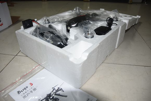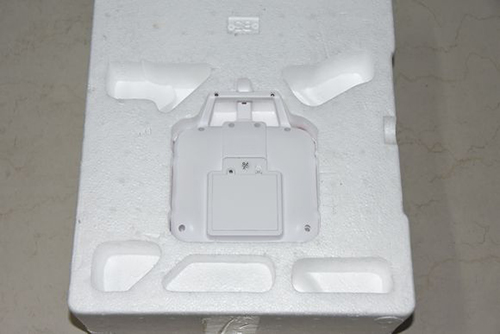 打开泡沫箱,“小怪兽”静静地躺在箱子里,飞机和螺旋桨,脚架,桨保护罩等都包在塑料包装袋里