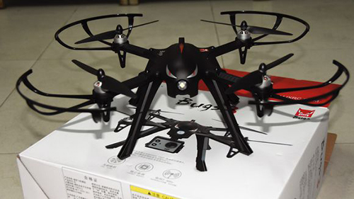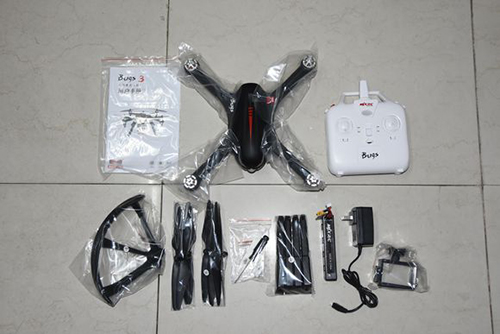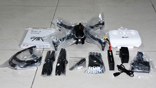 所有东西摆在一起来个集体照吧分别是说明书,飞机,遥控器,桨保护罩,两套桨,螺丝刀和遥控器摇杆,高脚架,电池,充电器,运动相机挂件