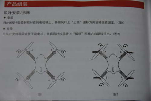 关于桨的安装方面,美嘉欣有很多完善的空间,前面也有吧友说过了,虽然说明书上明确标明了正反桨的分类和锁紧方向,但是对于那些不知道四轴飞行器原理,又不喜欢看说明书的新手来说确实不是一个很贴心的设计