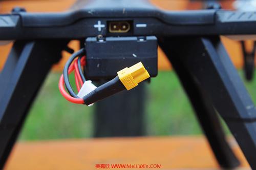 电池盒有两条走线插口,白色的对应充电器的插口,对于用户而言,我们可以当然直接连接充电器即可进行充电,也就是说可以直接给无人机充电,完全不用卸下电池。黄色的插口与无人机上的电源插口对应,插上小怪兽B3直接通电待飞。
