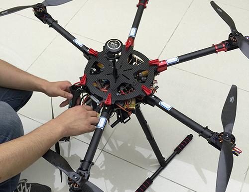 遥控器学习与检查、电池安装以及起飞前检测:讲解遥控器的功能分配与使用流程;将无人机放置平稳,电池检测、重检查设置警报电压(每次起降)、捆绑安装电池确认无误,遥控通电及检查确认无误,打开遥控器油门保护,接通电源,听飞控自检声音及观看飞控指示灯是否正常,起飞前准备完毕。