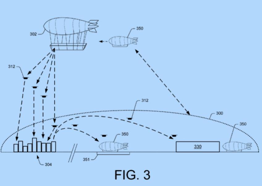 最新曝光的专利显示,亚马逊准备在天上建设配送中心,从专利图来看,配送中心就像架在了齐柏林飞艇上。