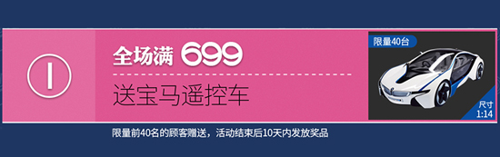 惊喜1. 美嘉欣全场满699订单前40名送宝马遥控车一台;